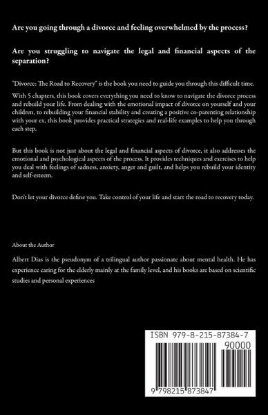 Are you going through a divorce and feeling overwhelmed by the process? Are you struggling to navigate the legal and financial aspects of the separation? "Divorce: The Road to Recovery" is the book you need to guide you through this difficult time. With 5 chapters, this book covers everything you need to know to navigate the divorce process and rebuild your life. From dealing with the emotional impact of divorce on yourself and your children, to rebuilding your financial stability and creating a positive co-parenting relationship with your ex, this book provides practical strategies and real-life examples to help you through each step. But this book is not just about the legal and financial aspects of divorce, it also addresses the emotional and psychological aspects of the process. It provides techniques and exercises to help you deal with feelings of sadness, anxiety, anger and guilt, and helps you rebuild your identity and self-esteem. Don't let your divorce define you. Take control of your life and start the road to recovery today with "Divorce: The Road to Recovery" . Whether you're looking for guidance, inspiration, or practical advice, this book is your ultimate guide to getting through this difficult time and coming out stronger on the other side. Buy now. About the Author Albert Dias is the pseudonym of a trilingual author passionate about mental health. He has experience caring for the elderly mainly at the family level, and his books are based on scientific studies and personal experiences. His mother was diagnosed with Alzheimer's when he was in his twenties, and his father died a few years earlier from cancer. As a result of these events, Abert Dias came to understand that stress is a part of life and can be better managed by learning how it affects him physically and mentally. He is also a great traveler who enjoys spending time with friends and reading.