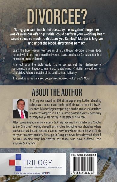 DIVORCEE? "Sorry, you can't teach that class...by the way, don't forget next week's missions offering! I wish I could perform your wedding, but it would cause so much trouble...see you Sunday!" Murder is forgiven under the blood, divorce not so much. Learn the true freedom we have in Christ. Although divorce is never God's perfect will, it does not mean the divorcee is a second-class Christian. God had no second-class children! Find out what the Bible really has to say without the interference of denominational baggage, man-made catechisms, Christian celebrities, or church law. Where the Spirit of the Lord is, there is liberty. This work is based on a fresh, objective, unbiased look at God's Word.