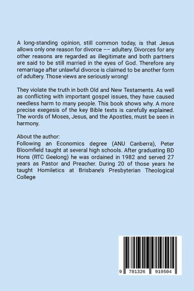 A long-standing opinion, still common today, is that Jesus allows only one reason for divorce -- adultery. Divorces for any other reasons are regarded as illegitimate and both partners are said to be still married in the eyes of God. Therefore any remarriage after unlawful divorce is claimed to be another form of adultery. Those views are seriously wrong! They violate the truth in both Old and New Testaments. As well as conflicting with important gospel issues, they have caused needless harm to many people. This book shows why. A more precise exegesis of the key Bible texts is carefully explained. The words of Moses, Jesus, and the Apostles, must be seen in harmony.