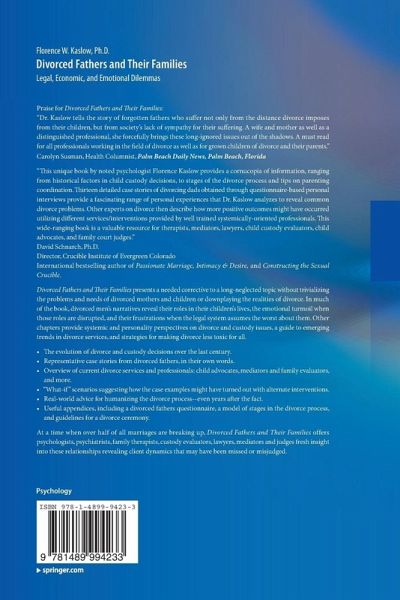 Endorsements: "Dr. Kaslow tells the story of forgotten fathers who suffer not only from the distance divorce imposes from their children, but from society's lack of sympathy for their suffering. A wife and mother as well as a distinguished professional, she forcefully brings these long-ignored issues out of the shadows. A must read for all professionals working in the field of divorce as well as for grown children of divorce and their parents." Carolyn Susman, health columnist, Palm Beach Daily News, Palm Beach, Florida "This unique book by noted psychologist Florence Kaslow provides a cornucopia of information, ranging from historical factors in child custody decisions, to stages of the divorce process and tips on parenting coordination. Thirteen detailed case stories of divorcing dads obtained through questionnaire-based personal interviews provide a fascinating range of personal experiences that Dr. Kaslow analyzes to reveal common divorce problems. Other experts on divorce then describe how more positive outcomes might have occurred utilizing different services/interventions provided by well trained systemically-oriented professionals. This wide-ranging book is a valuable resource for therapists, mediators, lawyers, child custody evaluators, child advocates, and family court judges." David Schnarch, Ph.D. Director, Crucible Institute of Evergreen Colorado International bestselling author of Passionate Marriage, Intimacy & Desire, and Constructing the Sexual Crucible. "Divorced Fathers and Their Families offers a key message for all who care about the welfare of children: While it is inevitably true that some marriages fail and husbands and wives may choose to sever their own legal ties, forging strong bonds between children and both of their parents should always be the paramount goal of our divorce and custody laws, policies and practices. In the absence of abuse, abandonment or other extraordinary circumstances, ensuring that fathers continue to play a central role in their children's lives - as well as the children's mother - will only advance, not impair, the emotional stability and well-being of children of divorce. Dr. Kaslow has provided important insights and useful suggestions for how we may to continue to move toward this goal." Marsha Levick, Juvenile Law Center, Philadelphia, PA "A superb and long overdue book! Kaslow has succeeded in capturing the untold story of the essence of the pain, confusion, turbulence, and unhappiness of divorce as experienced by the Dedicated Dads who all too often are partially or totally cut out of their children's lives. A must read for everyone who is contemplating divorce, is divorced, is a child of divorce or a professional working in the field of divorce." Diana Kirschner, Ph.D., bestselling author of Love in 90 Days, and of Sealing the Deal: The Love Mentor's Guide to Lasting Love. "This book is an invaluable resource for clinicians, divorced dads and their families! Read 13 fascinating and enlightening stories about "good dads' who are often disempowered by the system in regard to their parental rights. The result is that the whole family suffers. Dr. Kaslow has a dazzling breadth of understanding of all facets of this phenomenon and speaks to what she calls "divorce with integrity," an approach that can provide a way toward less pain and a healthier outcome in the wrenching process of divorce. Whether you work with family members who are struggling with divorce or in the midst of the process in your own family, definitely get a copy of this invaluable book!" Dr. Diana Kirschner "Any reviewer of the extensive literature on divorce quickly would note that it consists mostly of the voices or concerns of the mothers of divorce, to the neglect of the voices and concerns of the children and fathers of divorce. A growing literature finally is beginning to emerge that gives voice to the children of divorce (Fabricius, Braver, Diaz, & Velez, 2010; Finley, 2006; Finley & Schwartz, 2010; Marquardt, 2005). Florence Kaslow's book Divorced Fathers and Their Families: Legal, Economic, and Emotional Dilemmas gives voice to the experiences and concerns of the fathers of divorce... I highly recommend Divorced Fathers and Their Families to all who want to understand the lived experiences of the fathers of divorce and to those who more broadly seek family court reform. Two things set this book apart from earlier books on divorced fathers (e.g., Braver & O'Connell, 1998; Farrell, 2001). The first is the detailed individual case studies that give the reader an emotive as well as a cognitive understanding of the genuine pain and suffering experienced by these fathers. Such an understanding permits an empathetic appraisal of the lifelong consequences of divorce for fathers and their children and suggests how changes in family law and family court practice-such as equal shared parenting-can improve the life trajectories of all. Second, for those seeking family court reforms, this book not only demonstrates the need for such reform but also provides blueprints and guidelines for what needs to be changed to accomplish it. Family law reform and family court reform ultimately were Kaslow's goals in writing this book, and she admirably accomplishes both with the empathetic case studies and her detailed recommendations for all parties involved in the divorce process." Gordan E. Finley September 11, 2013, Vol. 58, Release 37, Article 8 PsycCRITIQUES