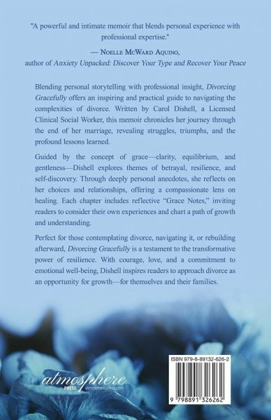 "A powerful and intimate memoir that blends personal experience with professional expertise." - Noelle McWard Aquino, author of Anxiety Unpacked: Discover Your Type and Recover Your Peace Blending personal storytelling with professional insight, Divorcing Gracefully offers an inspiring and practical guide to navigating the complexities of divorce. Written by Carol Dishell, a Licensed Clinical Social Worker, this memoir chronicles her journey through the end of her marriage, revealing struggles, triumphs, and the profound lessons learned. Guided by the concept of grace-clarity, equilibrium, and gentleness-Dishell explores themes of betrayal, resilience, and self-discovery. Through deeply personal anecdotes, she reflects on her choices and relationships, offering a compassionate lens on healing. Each chapter includes reflective "Grace Notes," inviting readers to consider their own experiences and chart a path of growth and understanding. Perfect for those contemplating divorce, navigating it, or rebuilding afterward, Divorcing Gracefully is a testament to the transformative power of resilience. With courage, love, and a commitment to emotional well-being, Dishell inspires readers to approach divorce as an opportunity for growth-for themselves and their families.