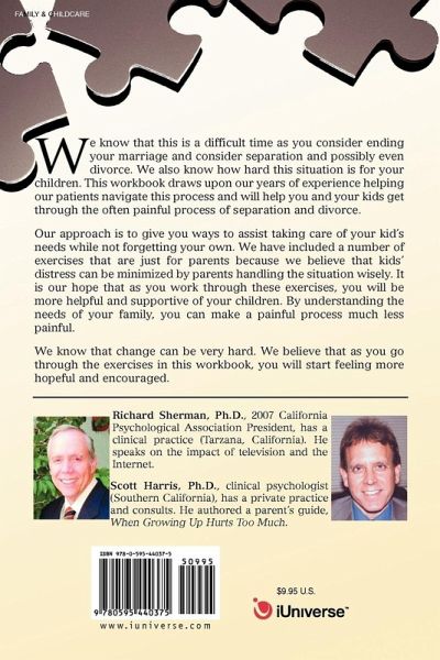 We know that this is a difficult time as you consider ending your marriage and consider separation and possibly even divorce. We also know how hard this situation is for your children. This workbook draws upon our years of experience helping our patients navigate this process and will help you and your kids get through the often painful process of separation and divorce. Our approach is to give you ways to assist taking care of your kid's needs while not forgetting your own. We have included a number of exercises that are just for parents because we believe that kids' distress can be minimized by parents handling the situation wisely. It is our hope that as you work through these exercises, you will be more helpful and supportive of your children. By understanding the needs of your family, you can make a painful process much less painful. We know that change can be very hard. We believe that as you go through the exercises in this workbook, you will start feeling more hopeful and encouraged.