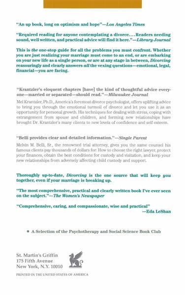 This is the one-step guide for all the problems you must confront. Whether you are just realizing your marriage must come to an end, or are embarking on your new life as a single person, or are at any stage in between, Divorcing reassuringly and clearly answers all the vexing questions-emotional, legal, financial-you are facing. Mel Krantzler, Ph.D., America's foremost divorce psychologist, offers uplifting advice to bring you through the emotional turmoil of divorce and let you use it as an opportunity for personal growth. His techniques for dealing with stress, coping with estrangement from spouse and children, and forming new relationships have brought Dr. Krantzler's many clients to new levels of confidence and self-esteem. Melvin M. Belli, Sr., the renowned trial attorney, gives you the same counsel his famous clients pay thousands of dollars for: How to choose the right lawyer, protect your finances, obtain the best conditions for custody and visitation, and keep your new relationships from adversely affecting child custody and support. Thoroughly up-to-date, Divorcing is one source that will keep you together, even if your marriage is breaking up.