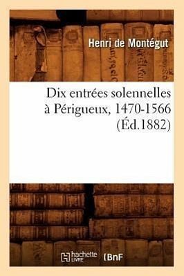 Dix entrees solennelles a Perigueux, 1470-1566 / publiees pour la premiere fois d'apres les manuscrits de la Bibliotheque nationale et les archives de la ville de Perigueux, par le President de Montegut,...Date de l'edition originale : 1882Sujet de l'ouvrage : Entrees (ceremonies) -- France -- Perigueux (Dordogne) -- RenaissanceCe livre est la reproduction fidele d'une oeuvre publiee avant 1920 et fait partie d'une collection de livres reimprimes a la demande editee par Hachette Livre, dans le cadre d'un partenariat avec la Bibliotheque nationale de France, offrant l'opportunite d'acceder a des ouvrages anciens et souvent rares issus des fonds patrimoniaux de la BnF.Les oeuvres faisant partie de cette collection ont ete numerisees par la BnF et sont presentes sur Gallica, sa bibliotheque numerique.En entreprenant de redonner vie a ces ouvrages au travers d'une collection de livres reimprimes a la demande, nous leur donnons la possibilite de rencontrer un public elargi et participons a la transmission de connaissances et de savoirs parfois difficilement accessibles.Nous avons cherche a concilier la reproduction fidele d'un livre ancien a partir de sa version numerisee avec le souci d'un confort de lecture optimal. Nous esperons que les ouvrages de cette nouvelle collection vous apporteront entiere satisfaction.Pour plus d'informations, rendez-vous sur www.hachettebnf.frhttp://gallica.bnf.fr/ark:/12148/bpt6k351409