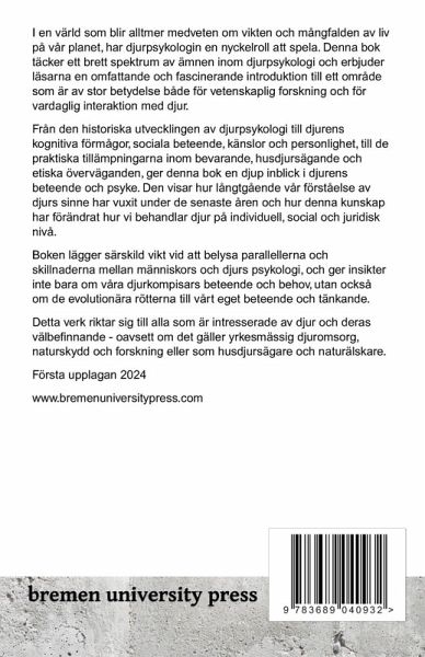 I en värld som blir alltmer medveten om vikten och mångfalden av liv på vår planet, har djurpsykologin en nyckelroll att spela. Denna bok täcker ett brett spektrum av ämnen inom djurpsykologi och erbjuder läsarna en omfattande och fascinerande introduktion till ett område som är av stor betydelse både för vetenskaplig forskning och för vardaglig interaktion med djur. Från den historiska utvecklingen av djurpsykologi till djurens kognitiva förmågor, sociala beteende, känslor och personlighet, till de praktiska tillämpningarna inom bevarande, husdjursägande och etiska överväganden, ger denna bok en djup inblick i djurens beteende och psyke. Den visar hur långtgående vår förståelse av djurs sinne har vuxit under de senaste åren och hur denna kunskap har förändrat hur vi behandlar djur på individuell, social och juridisk nivå. Boken lägger särskild vikt vid att belysa parallellerna och skillnaderna mellan människors och djurs psykologi, och ger insikter inte bara om våra djurkompisars beteende och behov, utan också om de evolutionära rötterna till vårt eget beteende och tänkande. Detta verk riktar sig till alla som är intresserade av djur och deras välbefinnande - oavsett om det gäller yrkesmässig djuromsorg, naturskydd och forskning eller som husdjursägare och naturälskare.