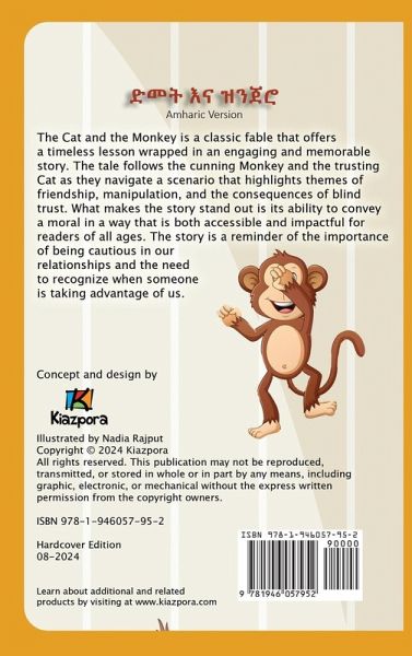 "The Cat and the Monkey" is a classic fable, translated to Amharic language, that offers a timeless lesson wrapped in an engaging and memorable story. The tale follows the cunning Monkey and the trusting Cat as they navigate a scenario that highlights themes of friendship, manipulation, and the consequences of blind trust. The story is simple yet effective. The Monkey, with its sly intelligence, persuades the Cat to do the dangerous work of retrieving chestnuts from the fire, only to selfishly eat them all without sharing. The Cat, who suffers from singed paws, learns a harsh lesson about the importance of discernment and the risks of being too trusting. It's a story that can spark meaningful conversations with children about trust, fairness, and the value of integrity in friendships.