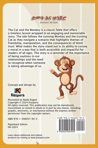 "The Cat and the Monkey" is a classic fable, translated to Amharic language, that offers a timeless lesson wrapped in an engaging and memorable story. The tale follows the cunning Monkey and the trusting Cat as they navigate a scenario that highlights themes of friendship, manipulation, and the consequences of blind trust. The story is simple yet effective. The Monkey, with its sly intelligence, persuades the Cat to do the dangerous work of retrieving chestnuts from the fire, only to selfishly eat them all without sharing. The Cat, who suffers from singed paws, learns a harsh lesson about the importance of discernment and the risks of being too trusting. It's a story that can spark meaningful conversations with children about trust, fairness, and the value of integrity in friendships.