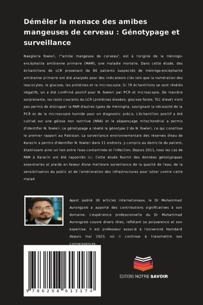 Naegleria fowleri, l'"amibe mangeuse de cerveau", est à l'origine de la méningo-encéphalite amibienne primaire (MAM), une maladie mortelle. Dans cette étude, des échantillons de LCR provenant de 80 patients suspectés de méningo-encéphalite amibienne primaire ont été analysés pour des indicateurs clés tels que la numération des leucocytes, le glucose, les protéines et la microscopie. Si 79 échantillons se sont révélés négatifs, un a été confirmé positif pour N. fowleri par PCR et microscopie. De manière surprenante, les tests courants du LCR (protéines élevées, glucose faible, TLC élevé) n'ont pas permis de distinguer la PAM d'autres types de méningite, soulignant la nécessité de la PCR et de la microscopie humide pour un diagnostic précis. L'échantillon positif a été cultivé sur une gélose non nutritive (NNA) et le séquençage mitochondrial a permis d'identifier N. fowleri. Le génotypage a révélé le génotype 2 de N. fowleri, ce qui constitue le premier rapport au Pakistan. La surveillance environnementale des réserves d'eau de Karachi a permis d'identifier N. fowleri dans 11 endroits, y compris au domicile du patient, établissant ainsi un lien entre l'eau contaminée et l'infection. Depuis 2011, tous les cas de PAM à Karachi ont été rapportés ici. Cette étude fournit des données génotypiques essentielles et plaide en faveur d'une meilleure surveillance de la qualité de l'eau, de la sensibilisation du public et de l'amélioration des infrastructures pour lutter contre cette malad