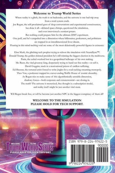 DMT Unplugged is an irreverent, mind-melting satire that dives headfirst into the swirling chaos of conspiracy culture, psychedelic misadventures, and the absurdity of internet-age influencers. Join Joe Rogan-definitely not a parody of a certain popular podcaster-as he embarks on an interdimensional experiment involving DMT, reality-bending podcasts, shape-shifting reptilians, wireless water, and a cosmic cast of exaggerated public figures like Donald Trump, Elon Musk, and Alex Jones. What starts as a trippy episode of a podcast spirals into a full-blown multiversal meltdown, where timelines loop, marketing pitches never end, and the only thing more warped than the space-time continuum is the ego of the guests. With a narrative that blends satire, sci-fi, and psychedelic parody, DMT Unplugged is a fever dream of fringe ideas, spiritual nonsense, and kaleidoscopic lunacy. If you've ever wondered what would happen if a conspiracy podcast collided with a Rick & Morty episode inside a sensory deprivation tank filled with kombucha-this is your answer. A bold, bizarre, and hysterically unhinged journey, this novel is both a love letter and a roast to the world of alt-media, ego-fueled influencers, and the endless quest for "truth" in a world that's already lost its grip on reality.