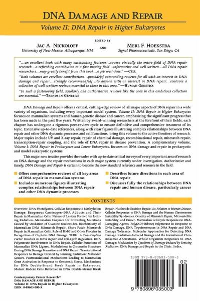 Cutting edge reviews by leading researchers illuminate key aspects of DNA repair in mammalian systems and its relationship to human genetic disease and cancer. Major topics include UV and X-Ray repair, repair of chemical damage, recombinational repair, mismatch repair, transcription-repair coupling, and the role of DNA repair in disease prevention. Extensive up-to-date references and rigorous peer-review of each chapter make this volume definitive and bring it to the active frontiers of research. DNA Damage and Repair offers a critical, cutting-edge review of all major aspects of DNA repair in a wide variety of organisms, including every important model system. Volume II: DNA Repair in Higher Eukaryotes focuses mammalian systems and human genetic disease and cancer, emphasizing the significant progress that has been made in the past five years. Written by award-winning researchers at the forefront of their fields, each chapter has undergone a rigorous peer-review cycle to ensure definitive and comprehensive treatment of its topic. Extensive up-to-date references, along with clear figures illustrating complex relationships between DNA repair and other DNA dynamic processes and cell functions, bring this volume to the active frontiers of research. Major topics include UV and X-ray repair, repair of chemical damage, recombinational repair, mismatch repair, transcription-repair coupling, and the role of DNA repair in disease prevention. A complementary volume, Volume I: DNA Repair in Prokaryotes and Lower Eukaryotes , focuses on DNA damage and repair in prokaryotic and model eukaryotic systems.