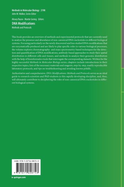 Authoritative and comprehensive, DNA Modifications: Methods and Protocols serves as an ideal guide to research scientists and PhD students in this rapidly developing discipline, and, thus, will ultimately contribute to deciphering the roles of non-canonical DNA nucleotides in different biological systems.