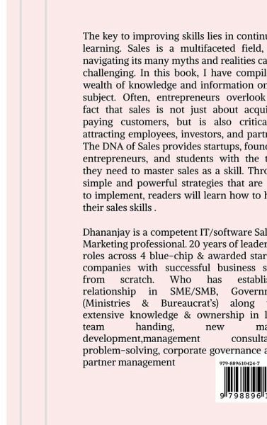 The DNA of Sales is a comprehensive guide designed to enhance the sales knowledge and practical skills of both experienced professionals and those with no formal training. Drawing on seven years of management theories, legal education, and over two decades of real-world sales observations, this book offers valuable insights for anyone looking to master the art of selling. This concise book covers all stages of the sales process from suspecting and prospecting to negotiation, closure, and post-sales service. It emphasizes the importance of developing both internal and external skills to excel in sales, with a focus on continuous learning and improvement. The book is especially useful for entrepreneurs and startups, highlighting that mastering sales is crucial not just for attracting customers but also for engaging employees, investors, and partners. The author presents actionable, easy-to-implement strategies that empower readers to refine their sales approach and achieve success. The DNA of Sales is an essential resource for salespeople, entrepreneurs, and management students, offering practical tools and strategies that can be applied immediately to boost performance and drive growth.