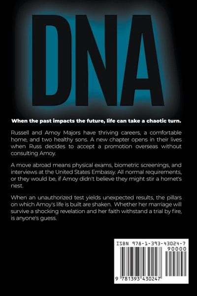 When the past impacts the future, life takes a chaotic turn. Russell and Amoy Majors have thriving careers, a comfortable home, and two healthy sons. A new chapter opens in their lives when Russ accepts a promotion overseas without consulting Amoy. A move abroad means physical exams, biometric screenings, and embassy interviews. All normal requirements, or they would be, if Amoy didn't believe they might stir a hornet's nest. When an unauthorized test yields unexpected results, the pillars on which Amoy's life is built are shaken. Whether her marriage will survive a shocking revelation and her faith withstand a trial by fire, is anyone's guess. ***DNA is inspirational fiction with a focus on marriage.