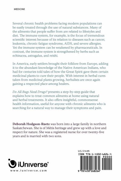 Several chronic health problems facing modern populations can be easily treated through the use of natural substances. Many of the ailments that people suffer from are related to lifestyles and diet. The immune system, for example, is the focus of tremendous scientific interest because of its relation to diseases such as cancer, leukemia, chronic fatigue syndrome, AIDS, and severe allergies. Yet the immune system can be weakened by pharmaceuticals. In contrast, the immune system is strengthened by herbs such as echinacea, astragalus, and reishi. In America, early settlers brought their folklore from Europe, adding it to the abundant knowledge of the Native American Indians, who had for centuries told tales of how the Great Spirit gave them certain medicinal plants to cure their people. With interest in herbal cures taken from medicinal plants growing, herbalists are once again gaining a respected place among healers. Do All Bugs Need Drugs? presents a step-by-step guide that explains how to treat common ailments at home using natural and herbal treatments. It also offers insightful, common sense health information, useful for anyone with chronic ailments who is searching for a natural way to manage their symptoms and pain.