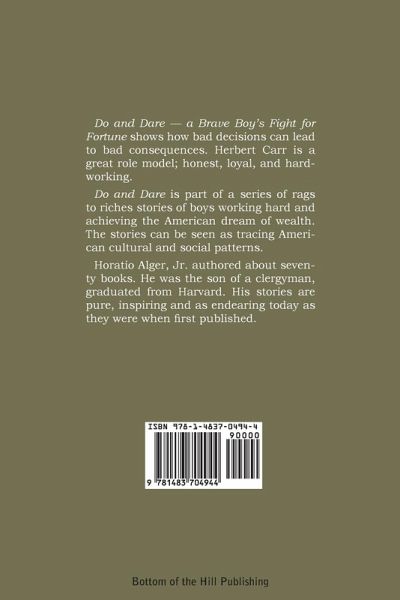 Do and Dare - a Brave Boy's Fight for Fortune shows how bad decisions can lead to bad consequences. Herbert Carr is a great role model; honest, loyal, and hardworking. Do and Dare is part of a series of rags to riches stories of boys working hard and achieving the American dream of wealth. The stories can be seen as tracing American cultural and social patterns. Horatio Alger, Jr. authored about seventy books. He was the son of a clergyman, graduated from Harvard. His stories are pure, inspiring and as endearing today as they were when first published.