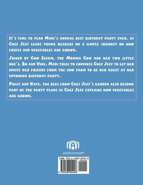 It's time to plan Madi's annual best birthday party ever, as Chef Jeff leads young readers on a simple journey on how fruits and vegetables are grown. Joined by Cow Seeum, the Momma Cow and her two little one's, Bo and Vine. Madi tries to convince Chef Jeff to let her invite her friends from the cow farm to be her guest at her upcoming birthday party. Polly and Nate, the bees from Chef Jeff's garden also become part of the party plans as Chef Jeff explains how vegetables are grown.