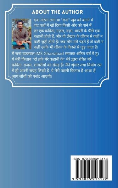 It took a long time for ""Rana"" to make itself Lost in a few moments to find someone else Every poem, ghazal, nazm, shayari has a story behind it, and they are related to the writer's life in some way or the other. When people read it, then somewhere they also get connected with the story of their life. I am Rana Ujjwal, IMS Ghaziabad in final year of graduation. This is my book ""Do Harf Mere Kahani Ke"" which is a collection of my poems, ghazals, shayris composed by me. I have written my collections in Shringar and Viyoga Ras, this is my first book, hope you guys will like it.