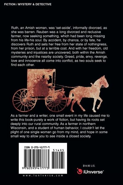 Ruth, an Amish woman, was 'set-aside', informally divorced, as she was barren. Reuben was a long divorced and reclusive farmer, now seeking something, which had been long missing from his life-his soul. By accident, by chance, or by fate, he discovers Ruth and sets her free from her state of nothingness, from her prison, but at a terrible cost. And with her freedom, old mysteries and injustices are uncovered, both within the Amish community and the nearby society. Greed, pride, envy, revenge, love and innocence all come into conflict, as two souls seek to find each other.