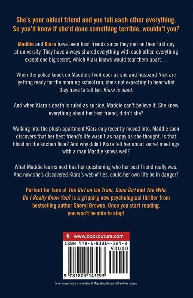 She's the friend you trust with your life. But can she trust you with hers? When the police knock on my door to tell me that my best friend Kiara has taken her life, my world shatters. Ever since we met at university along with my husband, Nathan and her ex-husband David, the four of us have been inseparable. I can't believe that, suddenly, she's not here. The police say that Kiara fell from the balcony of her small, pristine apartment. But I refuse to accept that she jumped. I thought I knew Kiara better than anyone. But I soon find out my friend was keeping some big secrets. Talking to her ex-husband, David, I'm shocked. Was she really having an affair, like he claims? Searching for evidence, I let myself into her apartment. My heart races as I find her diary and I read the name of her last appointment - Nathan. Why would she be meeting with my husband? And why didn't he tell me? It soon becomes clear that everyone around me has been hiding the truth, and when the police call again and ask me to look at CCTV footage from the night Kiara died, fear floods through me as I recognise her final visitor. Can I trust anyone in my life? And if someone did push Kiara that night, could I be next? Perfect for fans of The Girl on the Train, Gone Girl and The Wife, Do I Really Know You? is a gripping new psychological thriller from bestselling author Sheryl Browne. Once you start reading, you won't be able to stop! What readers are saying about Do I Really Know You?:'Wow! Sheryl Browne knocks it out of the park!... A huge five star read.' NetGalley reviewer, 5 stars 'Brilliant... I devoured this book... A definite must-read.' Goodreads reviewer, 5 stars 'Will leave you on the edge of your seat... Full of intrigue, mystery and twists and turns.' NetGalley reviewer, 5 stars 'Kept me glued to my Kindle!' Sassy Southern Books, 5 stars 'A great book by an amazing storyteller.' B for Bookreview, 5 stars 'I was hooked!' @bookscooffeemorebooks What readers are saying about Sheryl Browne:'Oh my goodness I can finally breathe!! What an amazing, addictive, totally gripping read this was... you will not be able to put it down!!!' Goodreads reviewer, 5 stars 'I read it in less than a day, I HAD to know what happened, to who and when!!!!... 10/10.' Goodreads reviewer, 5 stars 'Phew... Goosebumps, shivers down my spine and the hairs on the back of my neck were standing on end, that's how good this book is.' Goodreads reviewer, 5 stars 'Woah! This book was crazy good, talk about mind games! Wow, I feel out of breath after reading this! Absolutely sucked me in, I was totally captivated and couldn't put this one down... an incredible read... blew my mind.' Bonnie's Book Talk, 5 stars 'WOW! Grabbed me from the BIG bam in the beginning all the way to the last word! Twisted, twisty, dark, compulsive rollercoaster of a story!... Read this book!!' Goodreads reviewer, 5 stars
