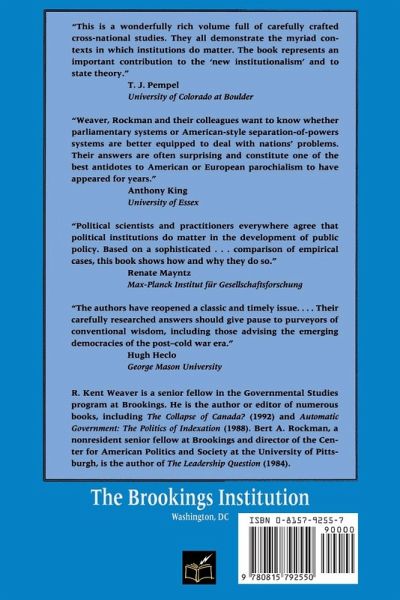 " As a stunning tide of democratization sweeps across much of the world, countries must cope with increasing problems of economic development, political and social integration, and greater public demand of scarce resources. That ability to respond effectively to these issues depends largely on the institutional choices of each of these newly democratizing countries. With critics of national political institutions in the United States arguing that the American separation-of-powers system promotes ineffectiveness and policy deadlock, many question whether these countries should emulate American institutions or choose parliamentary institutions instead. The essays in this book fully examine whether parliamentary government is superior to the separation-of-powers system through a direct comparison of the two. In addressing specific policy areas-such as innovation and implementation of energy policies after the oil shocks of 1970, management of societal cleavages, setting of government priorities in budgeting, representation of diffuse interest in environmental policy, and management of defense forces-the authors define capabilities that allow governments to respond to policy problems. Do Institutions Matter? includes case studies that bear important evidence on when and how institutions influence government effectiveness. The authors discover a widespread variation among parliamentary systems both in institutional arrangements and in governmental capabilities, and find that many of the failings of policy performance commonly attributed to American political institutions are in fact widely shared among western industrial countries. Moreover, they show how American political institutions inhibit some government capabilities while enhancing others. Changing American institutions to improve some aspects of governmental performance could hurt other widely valued capabilities. The authors draw important guidelines for institutional reformers wh"