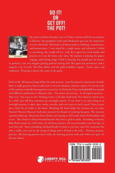 Early in life, all human beings follow the same process...your first practice experiences include. How to walk, go potty, how to talk, how to tie your shoelace, and use a spoon. So you see early in life a person is already learning how to practice. In this book, I have included different people with different professions to illustrate that... No matter the activity... It all requires practice... That is if... You want to win. Nothing is free, it all takes hard work. For whatever reason once in a while you will hear someone say, overnight success. To me there is no such thing as an overnight success, it takes, days, weeks, months, and even years to reach a goal. I have to give just a little bit of credit to the losers. Watching the losers helps the winners stay on track. Practice! Practice! Practice! And more practice! It's all part of winning the game. The moment a person wakes up...the person faces choices, am I going to call in sick, what's for breakfast, and so on... The winner is always focused because they have a goal to reach. According to history, Babe Ruth struck out 1330 times. It's all about practice. Do you remember your first day, on your first job? Heart pounding, forehead beads of sweat as you face your first customer, but after a while, you were in the swing of things and it all had to do with... Practice, practice, practice. The learning process never ends, the learning process ends only when you quit. It's all your choice. My name is Johnny Estrada, I am a US Navy veteran and I live in southern California. My grandson's trials and tribulations gave me the inspiration to write this book. This book is all about positive thinking, commitment, and perseverance. I was raised by a single mom, and whenever I failed at something, she would tell me...well, do it again but work harder and practice so I can do better next time. My passion is playing the piano, singing, and writing songs. I find it amazing that people pay me money to perform. Can you imagine getting paid for having fun? The quest has persistence and it requires a lot of work. The blue ribbon and the gold medallion require... Sweat, pain, and endurance. Winning is always the name of the game.