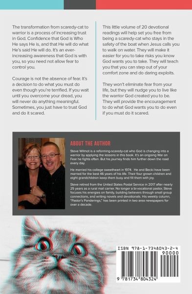 Steve Wilmot is a reforming-scaredy-cat who God is changing into a warrior by applying the lessons in this book. It's an ongoing War on Fear he fights often. But his journey finds him further down the road every day. He married his college sweetheart in 1974. He and Becki have been married for the best 46 years of his life. Their four grown children and eight grandchildren keep them busy and fill them with joy. Steve retired from the United States Postal Service in 2017 after nearly 25 years as a rural mail carrier. No longer a bi-vocational pastor, he focuses his energies on family, building believers through small group connections, and writing novels and devotionals. His weekly column, "Pastor's Ponderings," has been printed in two area newspapers for over a decade. In his spare time, he loves to read, work in his garden and landscaping around his house, and relax on his porch swing. Steve also enjoys speaking from God's Word and sharing his spiritual journey at churches and conferences.