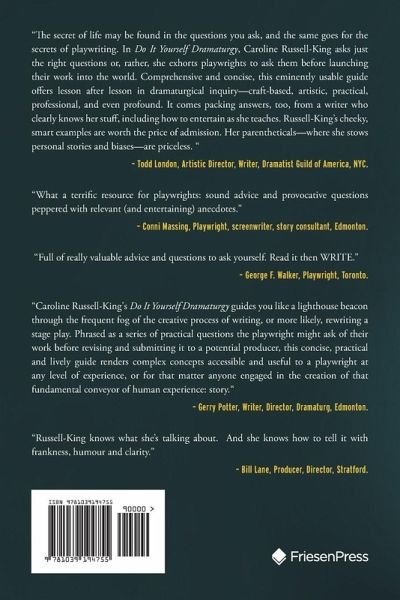 "The secret of life may be found in the questions you ask, and the same goes for the secrets of playwriting. In Do It Yourself Dramaturgy, Caroline Russell-King asks just the right questions or, rather, she exhorts playwrights to ask them before launching their work into the world. Comprehensive and concise, this eminently usable guide offers lesson after lesson in dramaturgical inquiry-craft-based, artistic, practical, professional, and even profound. It comes packing answers, too, from a writer who clearly knows her stuff, including how to entertain as she teaches. Russell-King's cheeky, smart examples are worth the price of admission. Her parentheticals-where she stows personal stories and biases-are priceless. " -Todd London, Artistic Director, Writer, Dramatist Guild of America, NYC. "What a terrific resource for playwrights: sound advice and provocative questions peppered with relevant (and entertaining) anecdotes." -Conni Massing, Playwright, screenwriter, story consultant, Edmonton. "Full of really valuable advice and questions to ask yourself. Read it then WRITE." -George F. Walker, Playwright, Toronto. "Caroline Russell-King's Do It Yourself Dramaturgy guides you like a lighthouse beacon through the frequent fog of the creative process of writing, or more likely, rewriting a stage play. Phrased as a series of practical questions the playwright might ask of their work before revising and submitting it to a potential producer, this concise, practical and lively guide renders complex concepts accessible and useful to a playwright at any level of experience, or for that matter anyone engaged in the creation of that fundamental conveyor of human experience: story." -Gerry Potter, Writer, Director, Dramaturg, Edmonton. "Russell-King knows what she's talking about. And she knows how to tell it with frankness, humour and clarity." -Bill Lane, Producer, Director, Stratford.