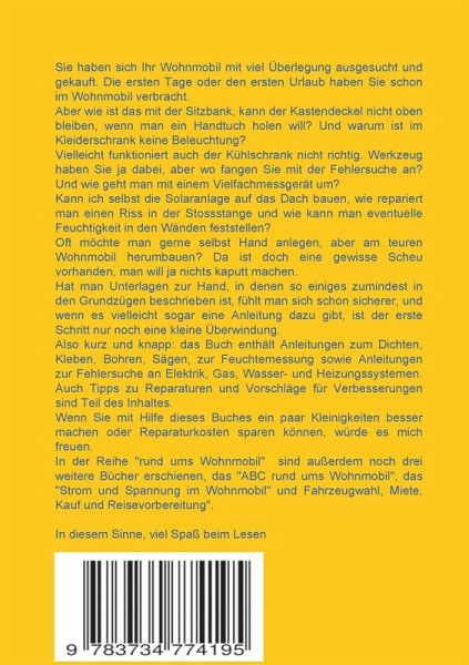 Ich bin sicher, dass Sie mit diesem Buch viele Anregungen und Tipps erhalten, wie Sie Ihre Gedanken zu Verbesserungen umsetzen oder eine eventuell notwendige Fehlersuche hoffentlich stressfreier durchführen können.Über fast vierzig Jahre Urlaub im Wohnmobil in Europa, im Sommer zum Surfen, im Winter zum Skifahren, zu zweit oder mit Kindern, in den unterschiedlichsten Wohnmobilen, bei 40°C in der Sonne oder im Schneesturm, da lernt man die Stärken und Schwächen seines mobilen Heimes kennen. Wenn man dann so im Urlaub entspannt, fällt einem selbst oder dem Partner immer irgendetwas auf, das Mann oder Frau am Wohnmobil verbessern könnte. Jedenfalls mir geht es so.Vielleicht funktioniert der Kühlschrank nicht richtig. Werkzeug haben Sie ja dabei, aber wo fangen Sie mit der Fehlersuche an? Und wie geht man mit einem Vielfachmessgerät um?Aber am teuren Wohnmobil herumbauen, da ist doch eine gewisse Scheu vorhanden, man will ja nichts kaputt machen. Auch mit den kleinen Reparaturen ist das so eine Sache, wo fängt man am besten an, und wo bekommt man Ersatzteile?Hat man Unterlagen zur Hand, in denen so einiges zumindest in den Grundzügen beschrieben ist, fühlt man sich schon sicherer, und wenn es vielleicht sogar eine Anleitung gibt, ist der erste Schritt nur noch eine kleine Überwindung.Eine kleine Anmerkung noch zu dem Thema Fehlersuche:Jedes Wohnmobil ist anders aufgebaut oder ausgestattet und jeder Mensch denkt in anderen Bahnen. Ich möchte nicht behaupten, dass meine Art zu suchen die richtige ist, aber meine Erfolgsquote ist beachtlich. Und wenn auch Sie auf diesem Wege Reparaturkosten sparen könnten, würde es mich freuen.Viel Erfolg und Spaß beim Lesen
