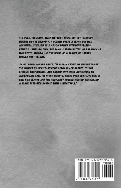 The play, "Do Jewish Lives Matter", arose out of the Crown Heights Riot in Brooklyn, a Pogrom where a Black boy was accidentally killed by a Hasidic driver with devastating results. James Baldwin, the famous Negro writer, as far back as 1948 wrote, Georgia has the Negro as a target of hatred. Harlem has the Jew. In 1973 Rabbi Kahane wrote, "In no way should we refuse to see the danger to Jews that comes from Black hatred. It is of epidemic proportions." And again in 1977, when addressing an audience, he said, "In Crown Heights, where poor Jews live side by side with Blacks and are regularly robbed, mugged, terrorized, a Black explosion against them is inevitable."