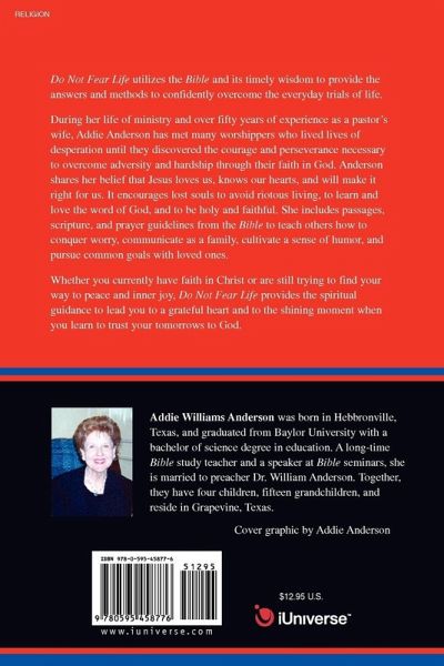 Do Not Fear Life utilizes the Bible and its timely wisdom to provide the answers and methods to confidently overcome the everyday trials of life. During her life of ministry and over fifty years of experience as a pastor's wife, Addie Anderson has met many worshippers who lived lives of desperation until they discovered the courage and perseverance necessary to overcome adversity and hardship through their faith in God. Anderson shares her belief that Jesus loves us, knows our hearts, and will make it right for us. It encourages lost souls to avoid riotous living, to learn and love the word of God, and to be holy and faithful. She includes passages, scripture, and prayer guidelines from the Bible to teach others how to conquer worry, communicate as a family, cultivate a sense of humor, and pursue common goals with loved ones. Whether you currently have faith in Christ or are still trying to find your way to peace and inner joy, Do Not Fear Life provides the spiritual guidance to lead you to a grateful heart and to the shining moment when you learn to trust your tomorrows to God.