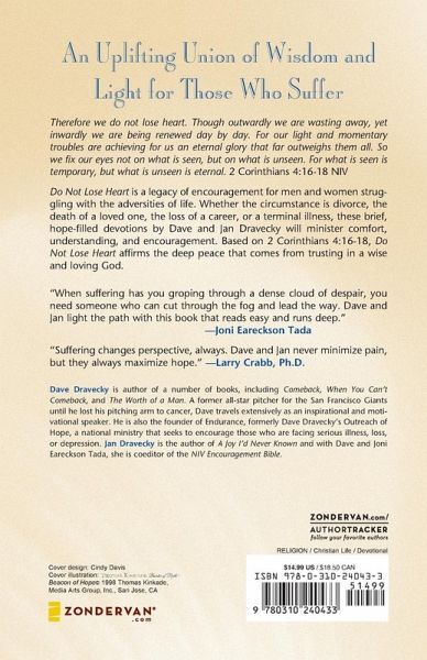 Devotional thoughts for those who are suffering--never minimizing pain, but always maximizing hope.There is no way to escape suffering. Sooner or later each one of us faces terrible loss or disappointment, whether the circumstance is divorce, the death of a loved one, the loss of a career, or a terminal illness. At such times, inspiring stories with happily-ever-after endings may not meet the need.Do Not Lose Heart is a collection of meditations for those who need to hear the truth about life in a fallen world and about how to get through suffering intact. Based on 2 Corinthians 4:16-18, Do Not Lose Heart affirms the deep peace that comes from trusting in a wise and loving God.