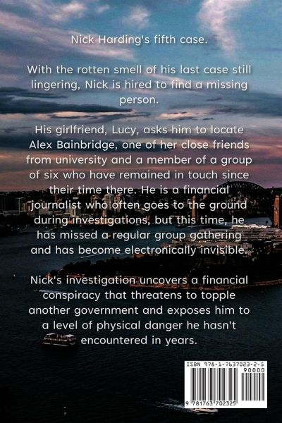 Nick Harding's fifth case. With the rotten smell of his last case still lingering, Nick is hired to find a missing person. His girlfriend, Lucy, asks him to locate Alex Bainbridge, one of her close friends from university and a member of a group of six who have remained in touch since their time there. He is a financial journalist who often goes to the ground during investigations, but this time, he has missed a regular group gathering and has become electronically invisible. Nick's investigation uncovers a financial conspiracy that threatens to topple another government, and exposes him to a level of physical danger he hasn't encountered in years.