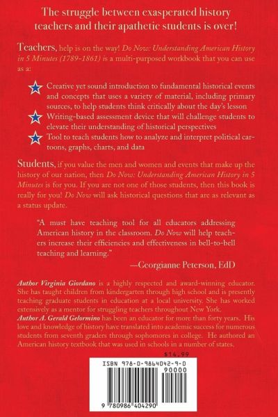 Teachers, help is on the way! Do Now: Understanding American History in 5 Minutes (1789-1861) is a multi-purposed workbook that you can use as a: Creative yet sound introduction to fundamental historical events and concepts. The book uses a variety of material, including primary sources, to help students think critically about historical lessons. Writing-based assessment device that will challenge students to elevate their understanding of historical perspectives. Tool to teach students how to analyze and interpret political cartoons, graphs, charts, and data. Students, if you value the men and women and events that make up the history of our nation, then Do Now: Understanding American History (1789-1861) in 5 Minutes is for you. If you are not one of those students, then this book is really for you! Do Now will ask historical questions that are as relevant as a status update.