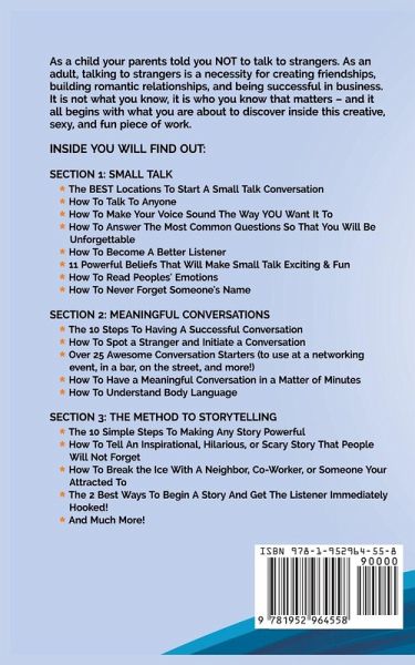 Have you ever seen someone who you wanted to talk to, but didn't have the words to say? Inside this conversational guide from social wizard, Matt Morris, you'll discover: Over 25 ways to easily start a conversation How to never forget someone's name What someone's body language is telling you The 10 simple steps to turn a boring story into an unforgettable one How to break the ice with a neighbor, coworker, or someone you're attracted to The 17 best locations to meet someone new How to never run out of stuff to say How to become an awesome listener How to immediately emotionally connect with someone And Much More! If you're shy, introverted, or simply aren't a pro at talking to strangers, then this guide is for you. The author, Matt Morris has a love and passion for talking to strangers, and doing what he can to make their day a bit brighter. As a kid, he was super shy and introverted, then he learned from some of the greatest social artists such as Dale Carnegie, Steven Covey, Tony Robbins, and Neil Strauss, and his life changed forever. Now he wants to share this wisdom with you in an easy step-by-step formula so that you can make friends everywhere you go. What Readers are Saying: "In "Do Talk to Strangers," Matt Morris covers why we should avoid the age old lesson - "Don't talk to strangers" - and being talking to strangers. Morris then goes on to explain how exactly to talk to strangers in three sections: Meaningful Conversations, Small Talk, and Method to Storytelling. I found the Meaningful Conversations section to be the most helpful for me. Because of social anxiety, it's very difficult for me to know what to say, how to say it, and when to say what. This section laid it out pretty simply: What matters most is letting go of the fear of rejection. There is even an entire chapter devoted to overcoming anxiety, which was also a great help to me. This book was full of great information! I highly recommend it to those who feel uncomfortable approaching people they don't know very well or those who have anxiety about any social interactions. However, I feel anyone could gain a lot from reading this book."