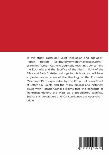 In this study, Latter-day Saint theologian and apologist, Robert Boylan (ScripturalMormonism.blogspot.com) examines Roman Catholic dogmatic teachings concerning the Eucharist and the Sacrifice of the Mass in light of the Bible and Early Christian writings. In this book, you will have a greater appreciation of the theology of the Eucharist ("Sacrament") as expounded by The Church of Jesus Christ of Latter-day Saints and the many biblical and historical issues with Roman Catholic claims that the concepts of Transubstantiation, the Mass as a propitiatory sacrifice, Eucharistic Veneration, and Concomitance are Apostolic in origin.