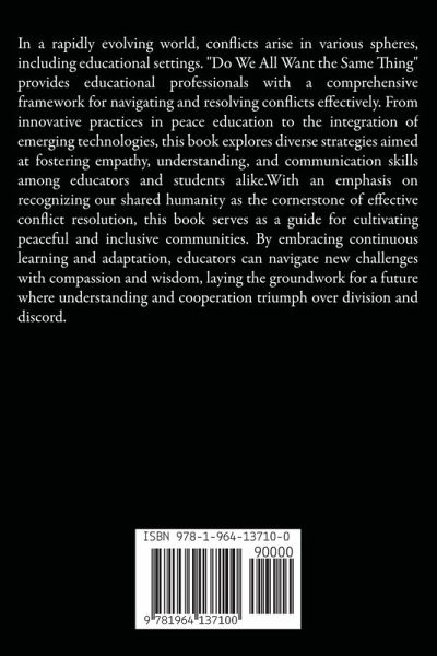 In a rapidly evolving world, conflicts arise in various spheres, including educational settings. "Do We All Want the Same Thing" provides educational professionals with a comprehensive framework for navigating and resolving conflicts effectively. From innovative practices in peace education to the integration of emerging technologies, this book explores diverse strategies aimed at fostering empathy, understanding, and communication skills among educators and students alike.With an emphasis on recognizing our shared humanity as the cornerstone of effective conflict resolution, this book serves as a guide for cultivating peaceful and inclusive communities. By embracing continuous learning and adaptation, educators can navigate new challenges with compassion and wisdom, laying the groundwork for a future where understanding and cooperation triumph over division and discord.
