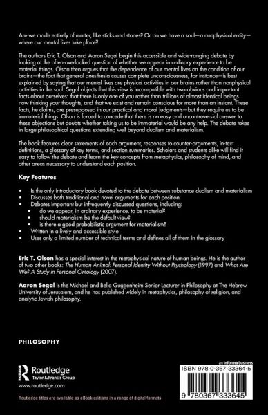 The authors Eric T. Olson and Aaron Segal begin this accessible and wide-ranging debate by looking at the often-overlooked question of whether we appear in ordinary experience to be material things. Olson then argues that the dependence of our mental lives on the condition of our brains-the fact that general anesthesia causes complete unconsciousness, for instance-is best explained by saying that our mental lives are physical activities in our brains rather than nonphysical activities in the soul. Segal objects that this view is incompatible with two obvious and important facts about ourselves: that there is only one of you rather than trillions of almost identical beings now thinking your thoughts, and that we exist and remain conscious for more than an instant. These facts, he claims, are presupposed in our practical and moral judgments-but they require us to be immaterial things. Olson is forced to concede that there is no easy and uncontroversial answer to these objections but doubts whether taking us to be immaterial would be any help. The debate takes in large philosophical questions extending well beyond dualism and materialism.