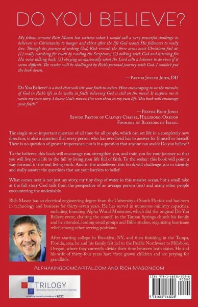 My fellow servant Rich Mason has written what I would call a very powerful challenge to believers in Christianity to hunger and thirst after the life God wants His followers to really live. Through his journey of seeking God, Rich reveals the three areas most Christians fail at: (1) really searching for truth by reading the Scriptures; (2) talking with God and listening for His voice talking back; (3) obeying unequivocally what the Lord calls a believer to do even if it seems difficult. The reader will be challenged by Rich's personal journey with God. I couldn't put the book down. - Pastor Joseph John, DD Do You Believe? is a book that will stir your faith to action. How encouraging to see the miracles of God in Rich's life as he walks in faith, believing God is still on the move! It inspires me to write my own story. I know God's moves; I've seen them in my own life. This book will encourage your faith." - Pastor Rich Jones, Senior Pastor of Calvary Chapel, Hillsboro, Oregon Founder of Blessors of Israel The single most important question of all time for all people, which can set life in a completely new direction, is also a question that every person who has ever lived has to answer for himself or herself. There is no question of greater importance, nor is it a question that anyone can avoid: Do you believe? To the believer: this book will encourage you, strengthen you, and train you for your journey so that you will live your life to the full by living your life full of faith. To the seeker: this book will point a way forward to the real living truth. And to the unbeliever: this book will challenge you to identify and really answer the questions that are your barriers to belief. What comes next is not just my story, my tiny drop of water in this massive ocean, but a small take at the full story God tells from the perspective of an average person (me) and many other people encountering the undeniable.