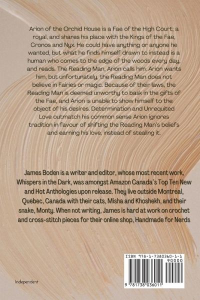 Arion of the Orchid House is a Fae of the High Court; a royal, and shares his place with the Kings of the Fae, Cronos and Nyx. He could have anything or anyone he wanted, but what he finds himself drawn to instead is a human who comes to the edge of the woods every day, and reads. The Reading Man, Arion calls him. Arion wants him, but unfortunately, the Reading Man does not believe in Fairies or magic. Because of their laws, the Reading Man is deemed unworthy to bask in the gifts of the Fae, and Arion is unable to show himself to the object of his desires. Determination and Unrequited Love outmatch his common sense Arion ignores tradition in favour of shifting the Reading Man's beliefs and earning his love, instead of stealing it.