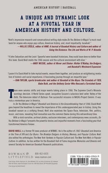 A unique and dynamic look at a pivotal year in American history and culture. There were seismic shifts taking place in 1966. The Supreme Court's Miranda warnings decision. A World Series upset. Jacqueline Susann's salacious best seller Valley of the Dolls. The television debut of Batman. Five successful missions in NASA's Project Gemini. It was truly a momentous year in America. In Do You Believe in Magic? Baseball and America in the Groundbreaking Year of 1966, David Krell goes beyond the headlines to reveal the importance of this underappreciated year in history. Using the baseball season as a unifying thread, Krell also examines the Space Race, television, film, politics, music, and more, revealing that innovation was the common theme during this extraordinary time. With a vivid narrative, archival photos, exclusive interviews, and contemporary news accounts, Do You Believe in Magic? presents the powerful stories and impactful moments from a fascinating year that transformed America forever.