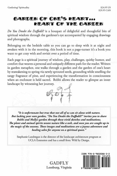 DO YOU DOUBT THE DAFFODIL is a bouquet of delightful and thoughtful bits of spiritual wisdom through the gardener's eye accompanied by engaging drawings and photographs. Belonging on the bedside table so you can go to sleep with it at night and awaken with it in the morning, this book is not a page-turner it's a book you want to get cozy with and revisit over a period of time. Each page is a spiritual journey of wisdom, play, challenges, quirky humor, and comfort that weaves a personal and uniquely different path for the reader. Written in garden metaphor, one walks through a garden and the garden of one's heart by reawakening to spring via newly sprouted seeds, grounding while smelling the tangy fragrance of pine, and experiencing the transformation in consciousness when an enclosure is held sacred. Bobbi Junod allows the reader to glimpse an inner landscape by witnessing her journey. If you are looking for a prize rose along your garden path, DO YOU DOUBT THE DAFFODIL provides the beauty and mystery that nature and spirit creates.