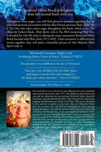 Reverend Helen Brock is delighted to share her second book with you. Throughout these pages, you will find glorious accounts regarding her up close and personal encounters with her Best Friend, precious Holy Spirit. He is The One who takes center stage, throughout this book, which is also The Heavenly Father's Book. Holy Spirit, who is The All-Consuming Holy Fire, is revealed for who He truly is, during the many encounters Reverend Helen Brock has had with Him, from 1971-2022. Each encounter is different and woven together, they will paint a beautiful picture of who Majestic Holy Spirit truly is: "Wonderful Counselor, Mighty God Everlasting Father, Prince of Peace." (Isaiah 6: NKJV) This prophecy was fulfilled on the day of Pentecost. "And they were all filled with the Holy Spirit and began to speak with other tongues as the Spirit gave them utterance." (Acts 2:4 NKJV) Sweet people, His Glory is...here! Reverend Helen Leona Brock has been Blessed with such wonderful supernatural experiences, since 1971. She delights to share them with you and her adoration for our precious Heavenly Father, beautiful Lord Jesus, and cherished Holy Spirit. Not a day goes by without her hugging and blowing sweet kisses to all Three. They are so cherished by her and she is careful to only write what our Heavenly Father gives her to write. You will find her worshiping all Three through singing and dance. You will also see her ministering Jesus' Power and Authority and through Him, in the open squares or across the malls, praying for the sick, raising the dead and/or casting out demons. She also has a passion for teaching others on how to have holy intimacy with the Lord, through worship and can be seen teaching from her book and the Bible on "The Bride of Christ," a locally televised show in Hawaii, with the ¿¿lelo Network, Channel 55 (they also have a downloadable app and are global, online).