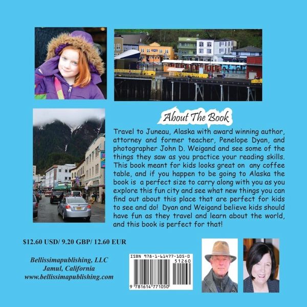 The area of Juneau is larger than that of Rhode Island and Delaware individually and almost as large as these two states combined. Downtown Juneau is nestled right at the base of Mount Juneau and is named after gold prospector Joe Juneau, although the place was for a time called Rockwell; and after that it was called Harrisburg after Juneau's co-prospector, who was named Richard Harris. That said, Juneau is a great place for kids where you can go to the top of a mountain in a tram and eat lunch, shop, see a wildlife center, and on a clear day look out over the town below you. Juneau is touristy and fun, and you can buy freshly made popcorn and fudge in a family owned store. Award winning author, attorney and former teacher Penelope Dyan, and photographer John D. Weigand traveled to Juneau, Alaska to see what they could see, and they saw plenty! There is fun, good food, friendly people (some dressed in costume) and more, and this once gold miners' town keeps the flavor of times past alive, all for your enjoyment. Use this book to practice reading skills through word recognition, repetition and rhyme as you take a little explore through this city stopped in time. And look for the Bellissimavideo music video that has the same name as this book on YouTube to add to the learning experience.