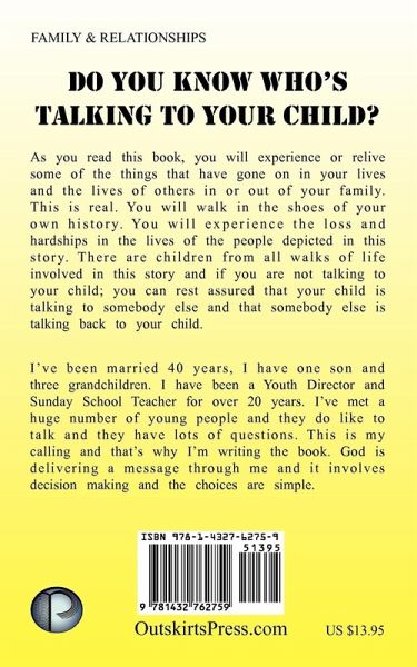 As you read this book, you will experience or relive some of the things that has gone on in your lives and the lives of others in or out of your family. This is real. You will walk in the shoes of your own history. You will feel the hardships and losses in the lives of the people depicted in this story. There are children from all walks of life involved in this story and if you are not talking to your child, your child you can be sure, your child is talking to somebody else.
