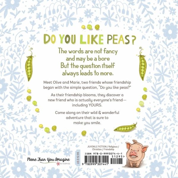 Meet Olive and Marie, two friends whose friendship began with the simple question, "Do you like peas?" The words are not fancy and the topic’s may be a bore. But the question itself always leads to more. As their friendship blooms, they discover a new friend who is actually everyone’s friend — including YOURS. Come along on their wild & wonderful adventure that is sure to make you smile.