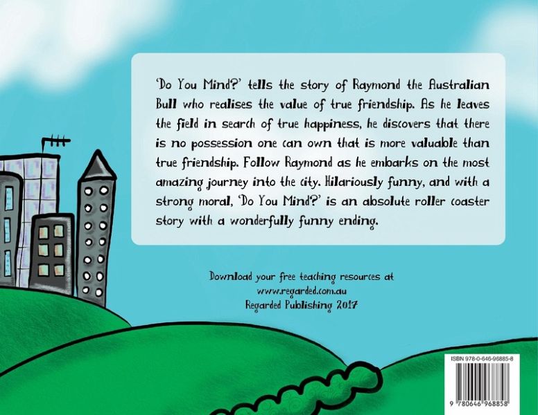 Do You Mind? tells the story of Raymond the Australian Bull who realises the value of true friendship. As he leaves the field in search of true happiness, he discovers that there is no possession one can own that is more valuable than true friendship. Follow Raymond as he embarks on the most amazing journey into the city. Hilariously funny, and with a strong moral, Do You Mind? is an absolute roller coaster story with a wonderfully funny ending. What can the book do for your child? The book works in several ways. Not only will children find this hilarious story entertaining, they will also learn the true value of friendship. In a world where material objects are all the rage, it is important that children realise that there are some things that money cannot buy and true friendship is one of those things. The book is designed to inspire conversations at home and in the classroom about what true friendship means and how life can be full of surprises. The science behind the story. Raymond is a bull that lives with his friends in the fields of Australia. When we look into fields filled with cows and bulls we often think they are randomly placed. In reality, bulls and cows often have several close friends whom they will stay with for life. Cows and bulls are some of the only animals on Earth known to shed actual tears when upset. They crave affection and love being personally named. Raymond realises that the most valuable thing one can own is true friendship. He leaves behind his new material possessions and seeks the one thing that makes him truly happy. 47 pages, Hardcover