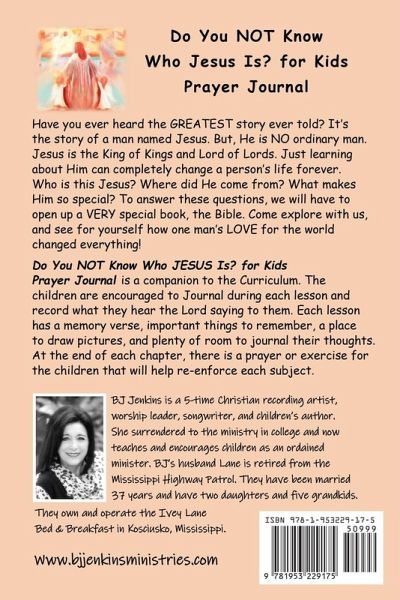 Do You NOT Know Who Jesus Is? for Kids Prayer Journal Have you ever heard the GREATEST story ever told? It's the story of a man named Jesus. But, He is NO ordinary man. Jesus is the King of Kings and Lord of Lords. Just learning about Him can completely change a person's life forever. Who is this Jesus? Where did He come from? What makes Him so special? To answer these questions, we will have to open up a VERY special book, the Bible. Come explore with us, and see for yourself how one man's LOVE for the world changed everything! Do You NOT Know Who JESUS Is? for Kids Prayer Journal is a companion to the Curriculum. The children are encouraged to Journal during each lesson and record what they hear the Lord saying to them. Each lesson has a memory verse, important things to remember, a place to draw pictures, and plenty of room to journal their thoughts. At the end of each chapter, there is a prayer or exercise for the children that will help re-enforce each subject.