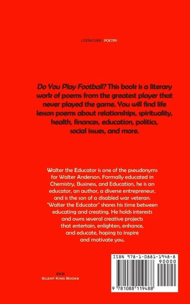 Do You Play Football? Poems about Life Lessons from the Greatest Player that Never Played the Game Do You Play football? This book is a literary work of poems from the greatest player that never played the game. You will find life lesson poems about relationships, spirituality, health, finances, education, politics, social issues, and more. Yes, I confess. I am the greatest player that never played the game. My skillset, strength, and speed were the best. So much so that every single (with emphasis) day in college, coaches begged me to play the game they loved and adored. After succumbing to their consistent groveling, I practiced, competed, and outplayed players that were NFL professional draft picks before determining that the game they loved was not in my heart. I had nothing against the game, but I had no love for the game, and you should have love for a game that can cause you life-threatening injuries. Even after determining that I would not play, football agents insisted on representing an impassionate young man because my unofficial Wonderlic score was perfect (50/50), my strength was enduring (225 pounds 60 consecutive times - unofficial), and my speed was the fastest time ever recorded for a defensive end (4.29 - unofficial). I insisted on not playing; prognosticators predicted that I would. I never did, making me the greatest player that never played the game, in my opinion. My football swag never went away. Years removed from the unapologetic decision to move on from the game everybody else loved, people always continuously commented, "Do you play football?" That question asked of me sparked so many debates about life in general that I decided to create this poetry book about the life lessons learned generated from the conversations sparked.
