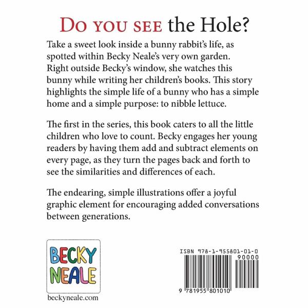 Do You See the Hole? Take a sweet look inside a bunny rabbit's life, as spotted within Becky Neale's very own garden. Right outside Becky's window, she watches this bunny while writing her children's books. This story highlights the simple life of a bunny who has a simple home and a simple purpose: to nibble lettuce. The first in the series, this book caters to all the little children who love to count. Becky engages her young readers by having them add and subtract elements on every page, as they turn the pages back and forth to see the similarities and differences of each. The endearing, simple illustrations offer a joyful graphic element for encouraging added conversations between generations.