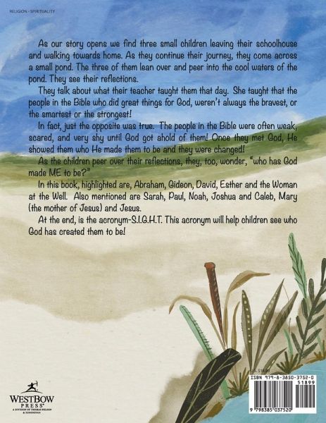 As our story opens we find three small children leaving their schoolhouse and walking towards home. As they continue their journey, they come across a small pond. The three of them lean over and peer into the cool waters of the pond. They see their reflections. They talk about what their teacher taught them that day. She taught that the people in the Bible who did great things for God, weren't always the bravest, or the smartest or the strongest! In fact, just the opposite was true. The people in the Bible were often weak, scared, and very shy until God got ahold of them! Once they met God, He showed them who He made them to be and they were changed! As the children peer over their reflections, they, too, wonder, "who has God made ME to be?" In this book, highlighted are, Abraham, Gideon, David, Esther and the Woman at the Well. Also mentioned are Sarah, Paul, Noah, Joshua and Caleb, Mary (the mother of Jesus) and Jesus. At the end, is the acronym-S.I.G.H.T. This acronym will help children see who God has created them to be!